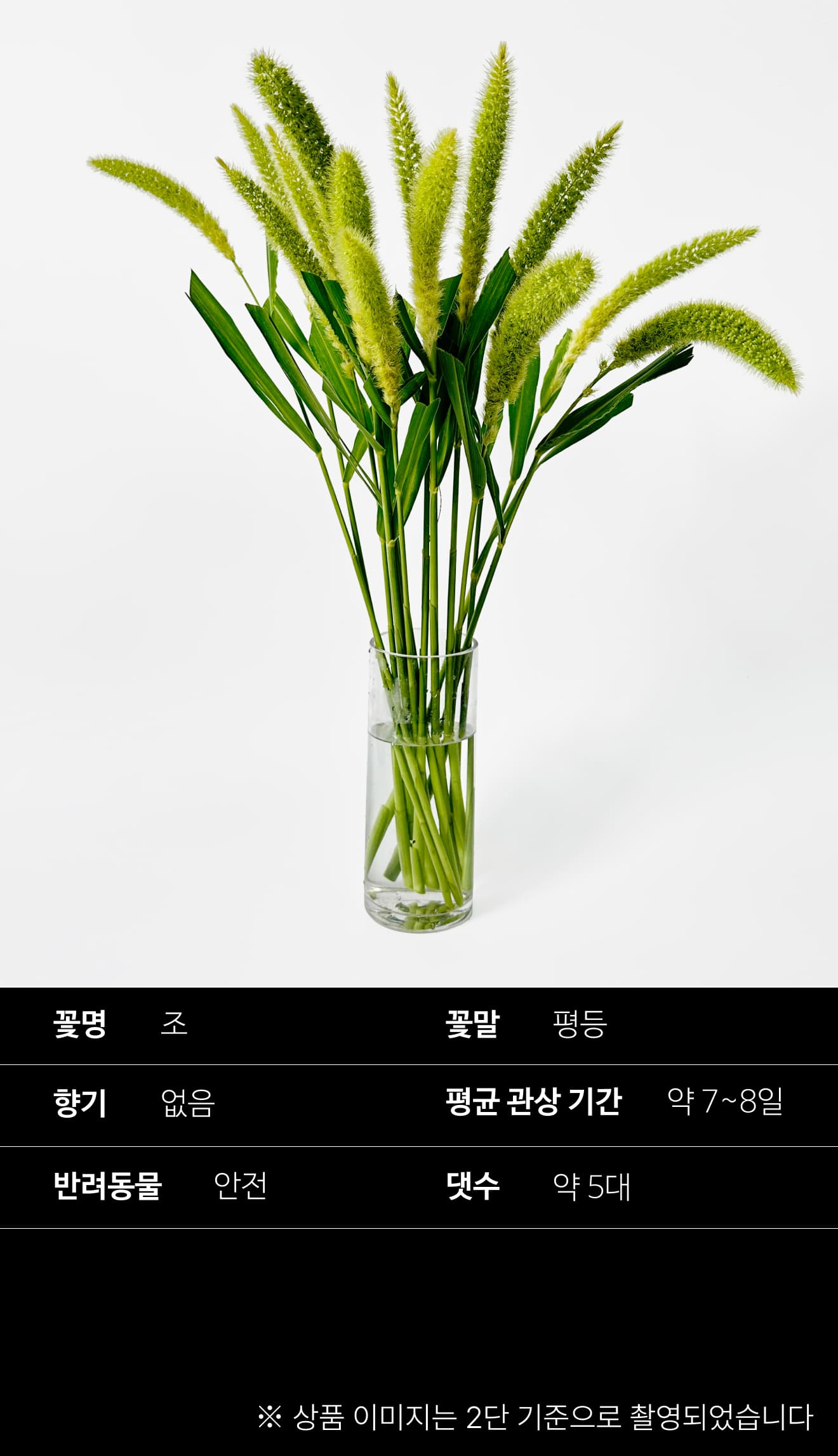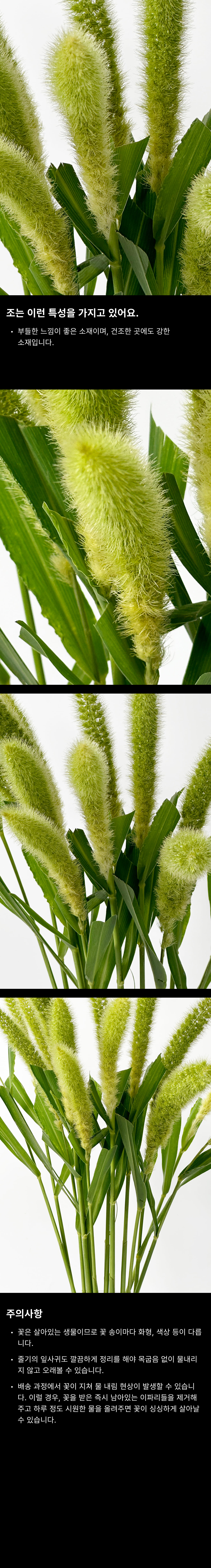 보송보송한 질감을 가진 조는 어느 꽃과 함께두어도 존재감을 확실히 보여주는 소재입니다. 라인감이 살아있는 조를 다른 소재와 함께 연출해보세요!