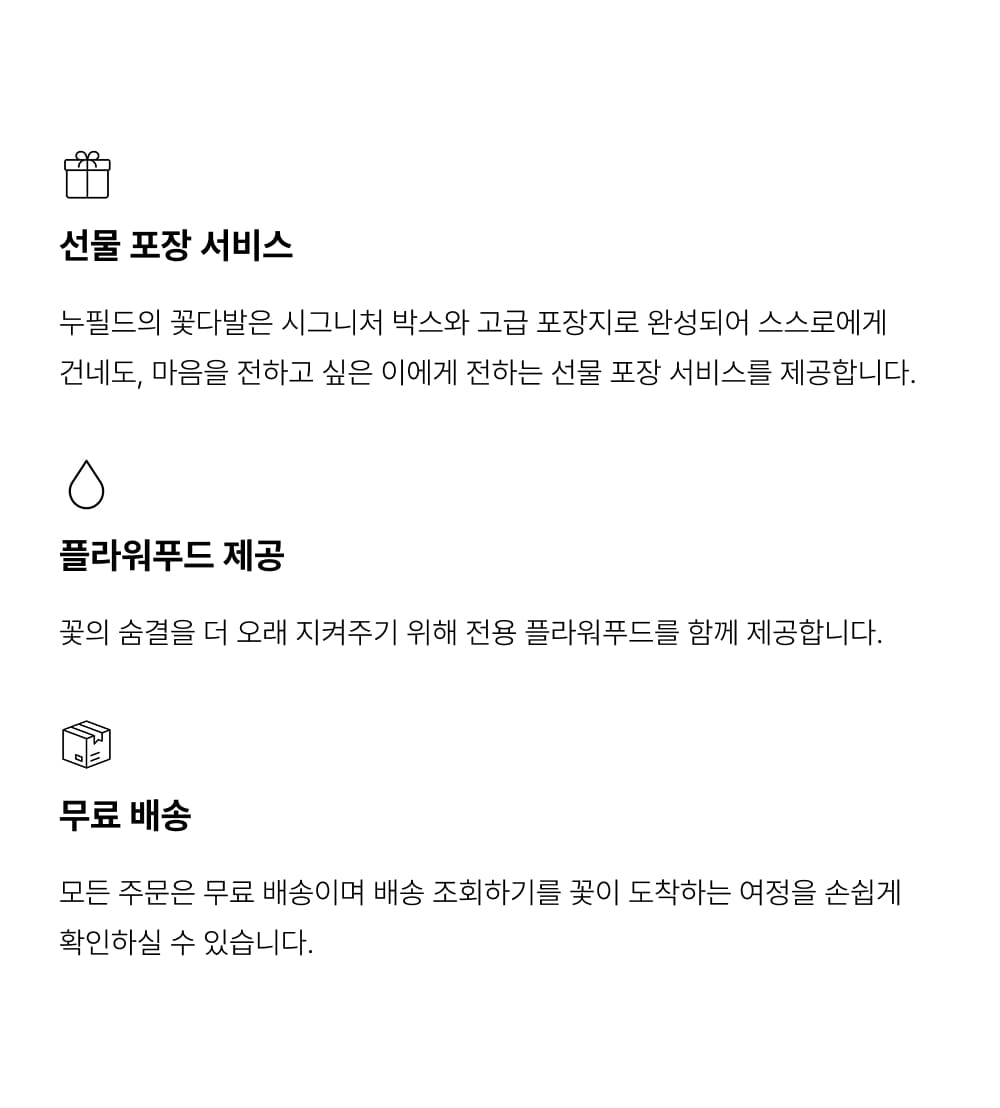 누필드 공식 온라인 스토어에서 구매하는 모든 분들께 선물 포장 서비스를 제공해 드리고 있습니다. 메세지 작성을 원하신다면 구매 시 선택 추가를 장바구니에 포함 후 결제 창에서 편지를 자유롭게 작성해주세요.