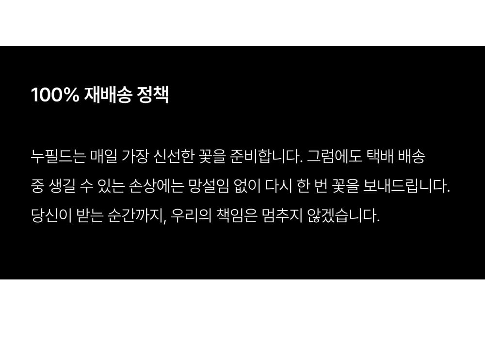 제품에 하자가 있을 시, 무료 재 배송 서비스를 이용하실 수 있습니다. 수령하신 날로부터 1일 이내에 접수해주셔야 하며, 제품의 사진과 함께 고객센터로 연락주시면, 재배송 또는 환불 처리를 도와드리고 있습니다.