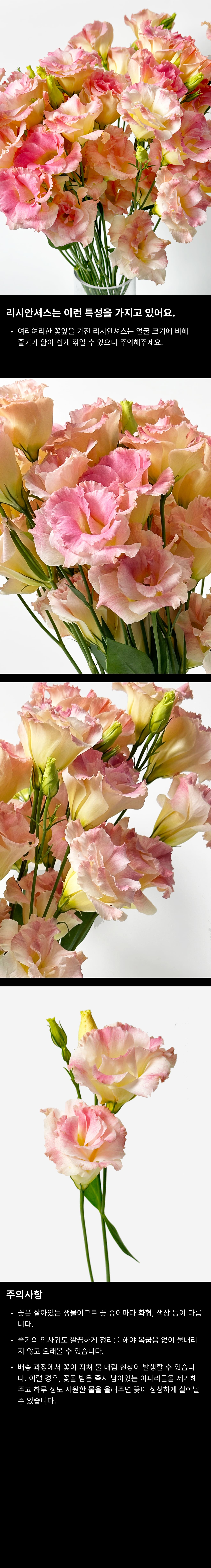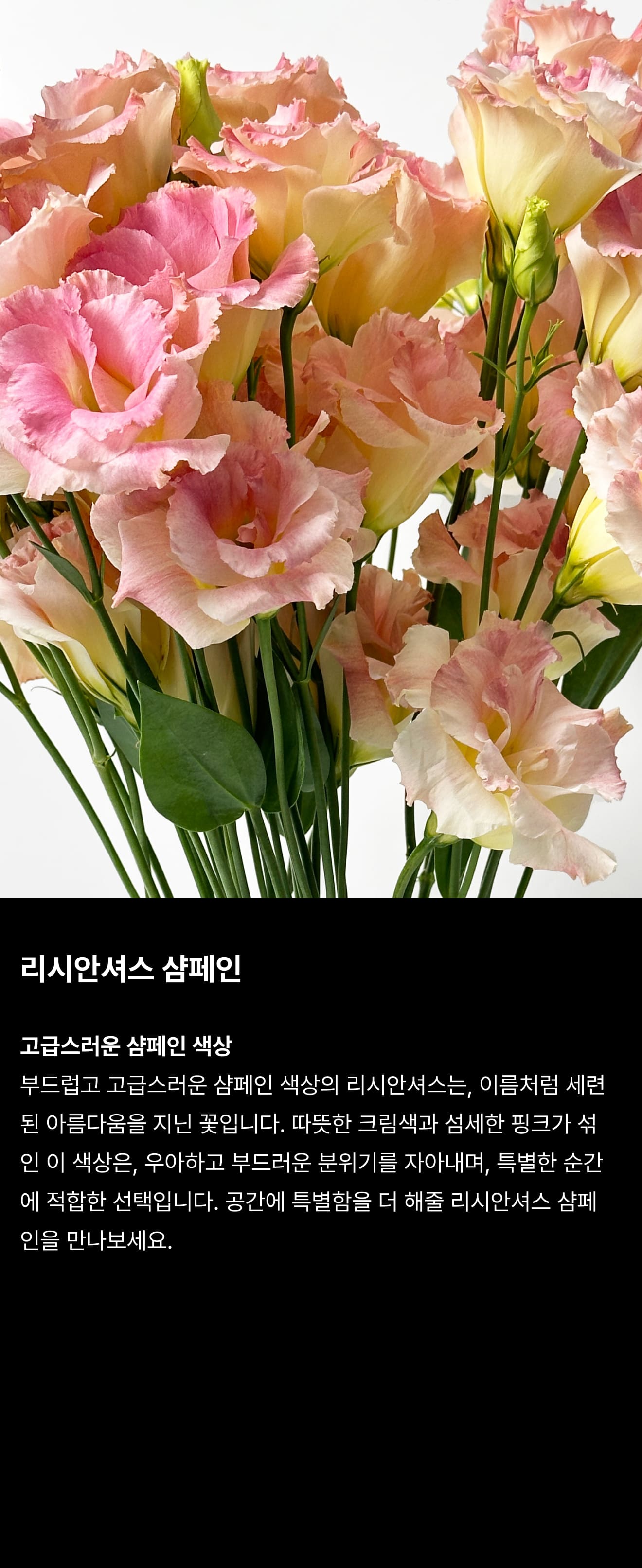 부드럽고 고급스러운 샴페인 색상의 리시안셔스는, 이름처럼 세련된 아름다움을 지닌 꽃입니다. 따뜻한 크림색과 섬세한 핑크가 섞인 이 색상은, 우아하고 부드러운 분위기를 자아내며, 특별한 순간에 적합한 선택입니다. 공간에 특별함을 더 해줄 리시안셔스 샴페인을 만나보세요.