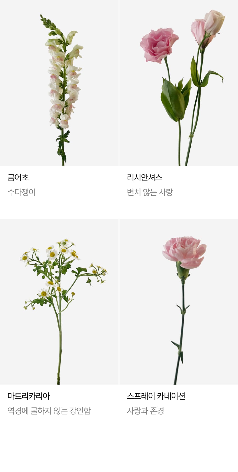 간결하면서도 강렬한 디자인의 포인트 꽃다발을 소개합니다. 작은 공간이나 가벼운 서프라이즈에 어울리는 쁘띠 꽃다발은 ‘작지만 강렬한 존재감’이란 컨셉으로 작은 공간에서도 빛을 발하죠. 당신만의 소중한 공간에 나만의 작은 정원을 꾸며보세요.